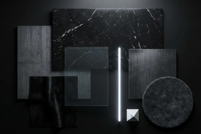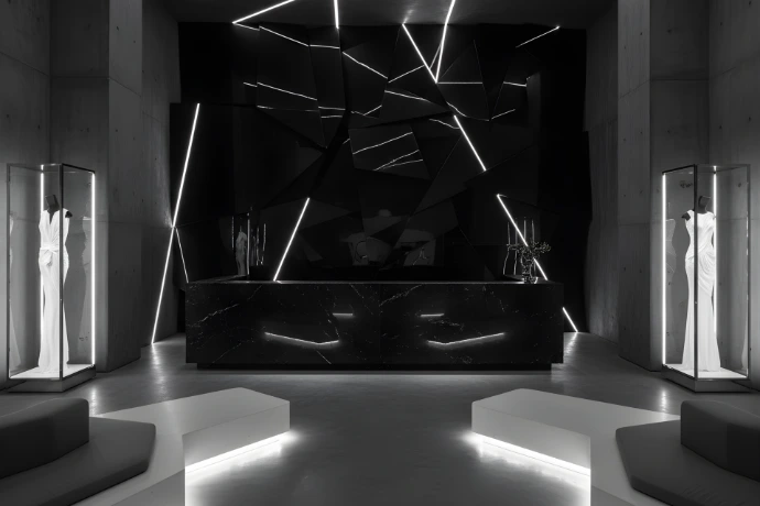 Material Rigor: A cold synthesis of polished obsidian, matte charcoal concrete, and glass monoliths creates a tactile experience that reinforces brand authority.